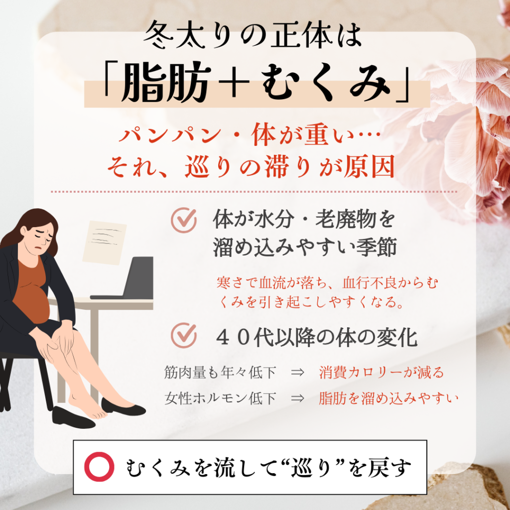 冷えで巡りが落ちると、体が水分を溜め込みやすくなり、見た目も体感も“重だるい”状態になりがちです。